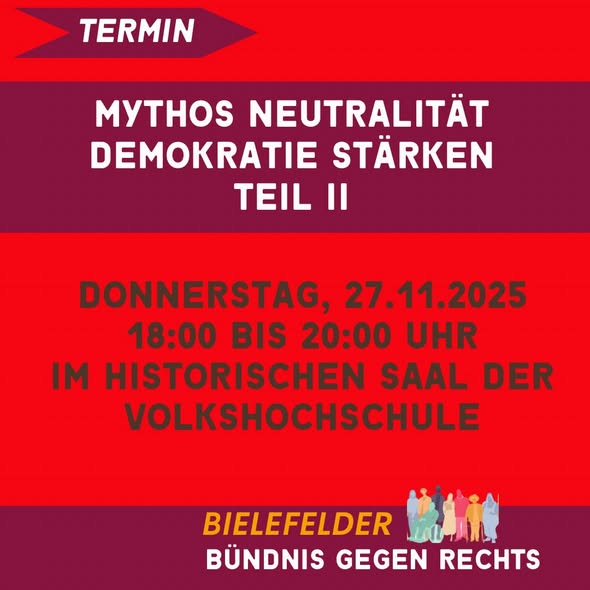 Organisationen, Vereine und Institutionen erleben auch in Bielefeld einen Neutralitätsdruck von Rechts. Die Veranstaltung ermöglicht einen Austausch über derartige Erfahrungen: Wie stellen sich Neutralisierungsversuche dar? Warum gibt es immer wieder einen ‘vorauseilenden Gehorsam’, obwohl Neutralität nur ein Mythos ist? Solche Fragen werden vor dem Hintergrund konkreter Erfahrungen von Bielefelder Initiativen und Zusammenschlüssen diskutiert. Ziel der Veranstaltung ist über das angebliche “Neutralitätsgebot” aufzuklären und Möglichkeiten der Gegenwehr kennenzulernen.