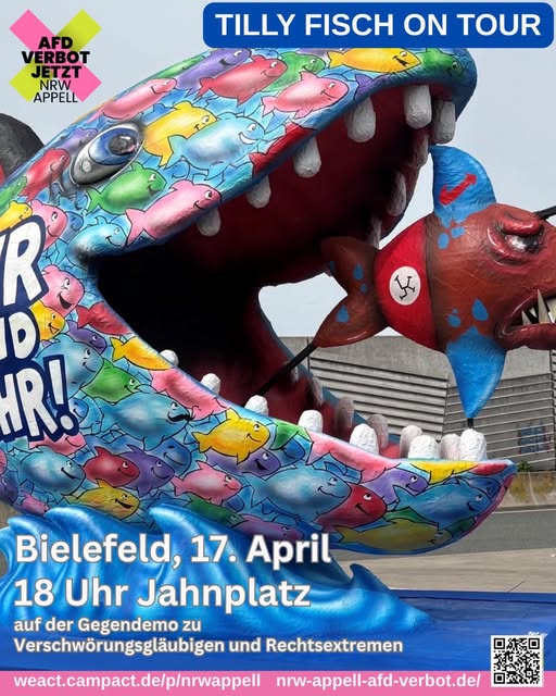 In Bielefeld wollen am 17. April wieder Neonazis, Reichsbürger*innen und Verschwörungsgläubige durch die Stadt marschieren. Wir halten dagegen – mit Engagement, Zusammenhalt, Solidarität und dem Tilly-Fisch!